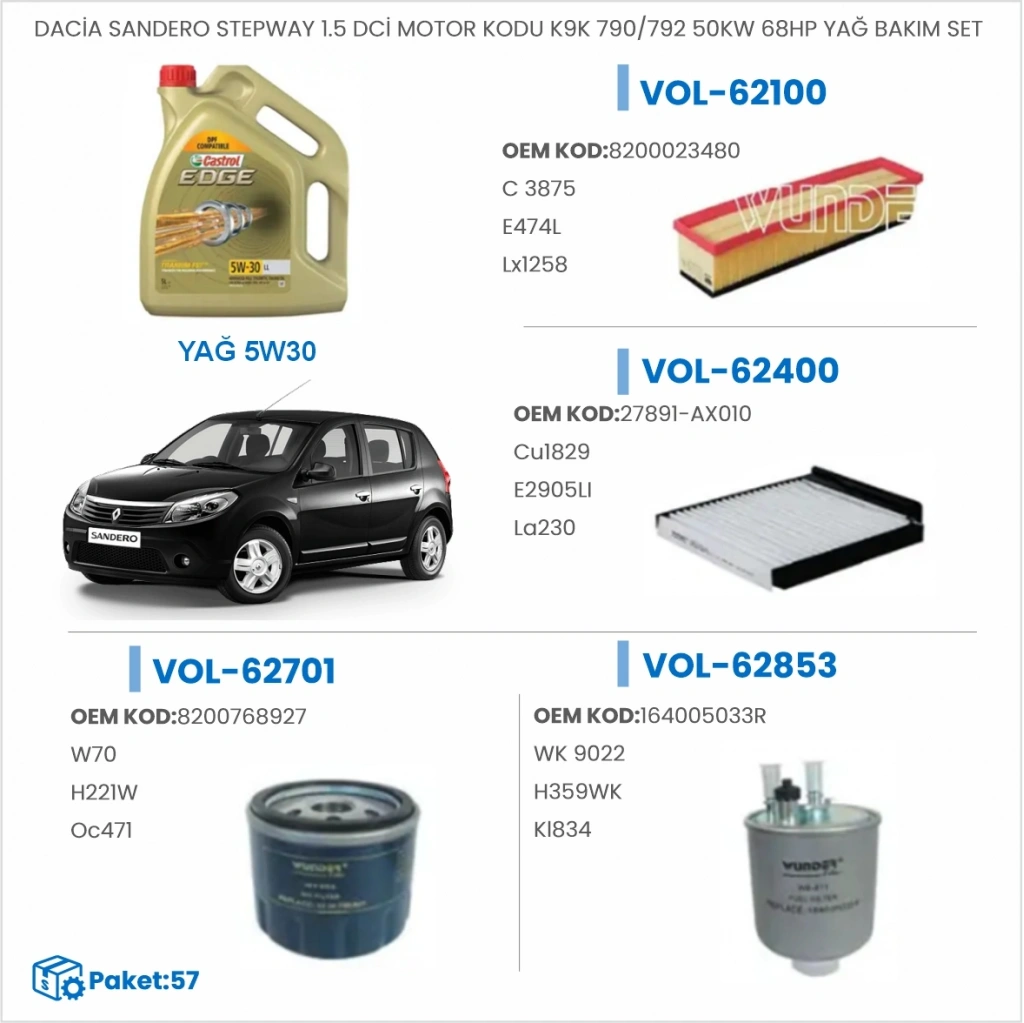 DACİA SANDERO STEPWAY 1.5 DCİ MOTOR KODU K9K 790/792 50KW 68HP YAĞ BAKIM SETİ