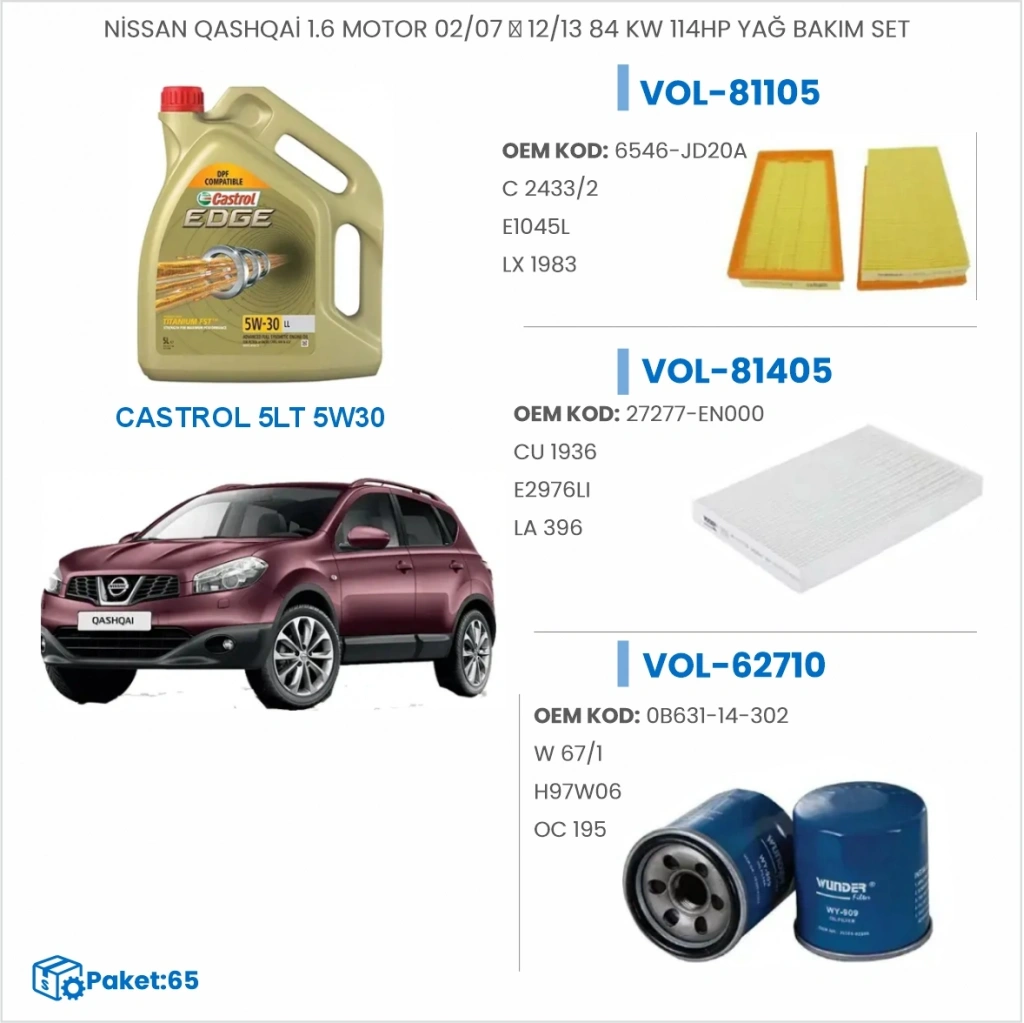NİSSAN QASHQAİ 1.6 MOTOR 02/07 → 12/13 84 KW 114HP YAĞ BAKIM SETİ