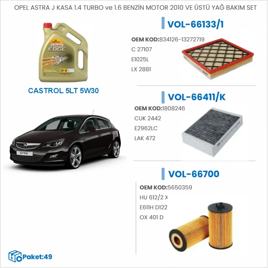 OPEL ASTRA J KASA 1.4 TURBO ve 1.6 BENZİN MOTOR 2010 VE ÜSTÜ YAĞ BAKIM SETİ