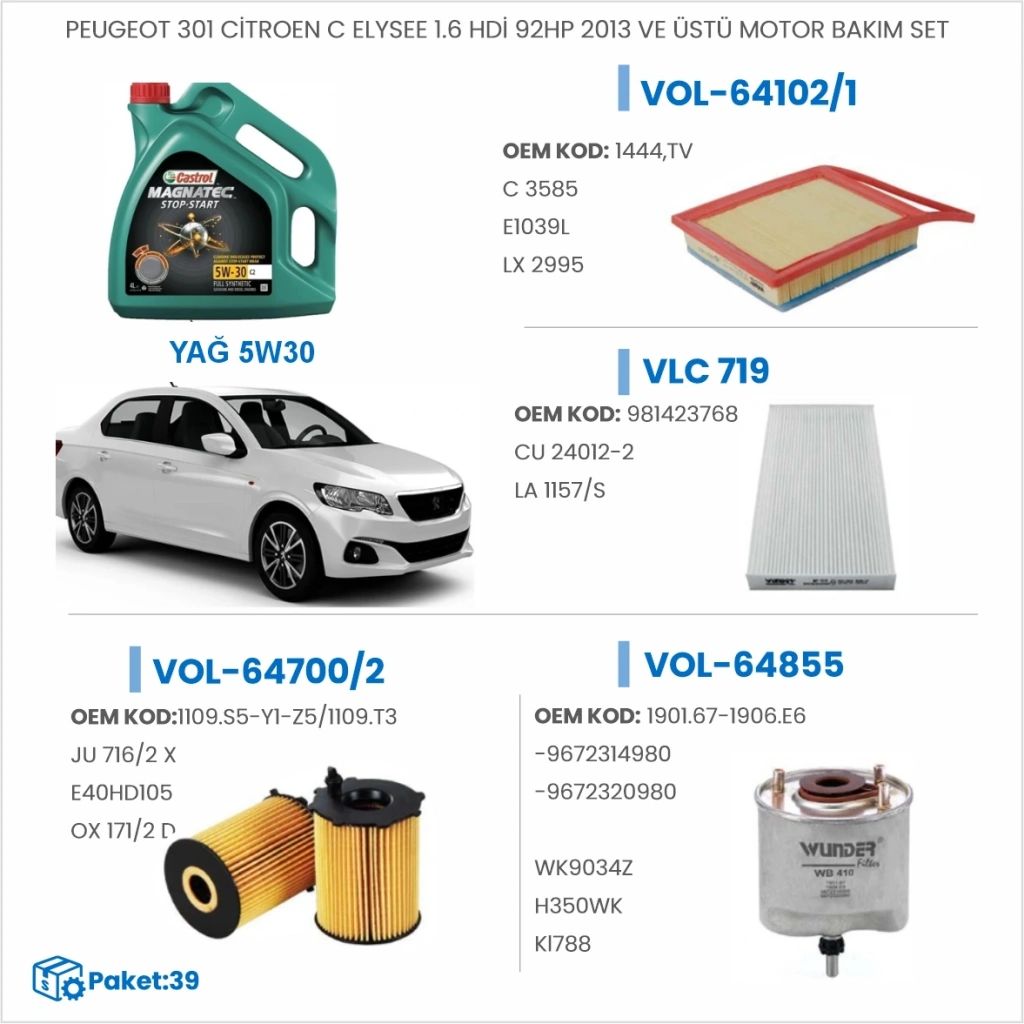 PEUGEOT 301 CİTROEN C ELYSEE 1.6 HDİ 92HP 2013 VE ÜSTÜ MOTOR BAKIM SETİ