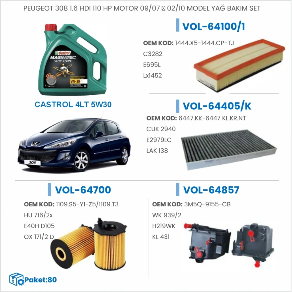 PEUGEOT 308 1.6 HDI 110 HP MOTOR 09/07 → 02/10 MODEL YAĞ BAKIM SETİ